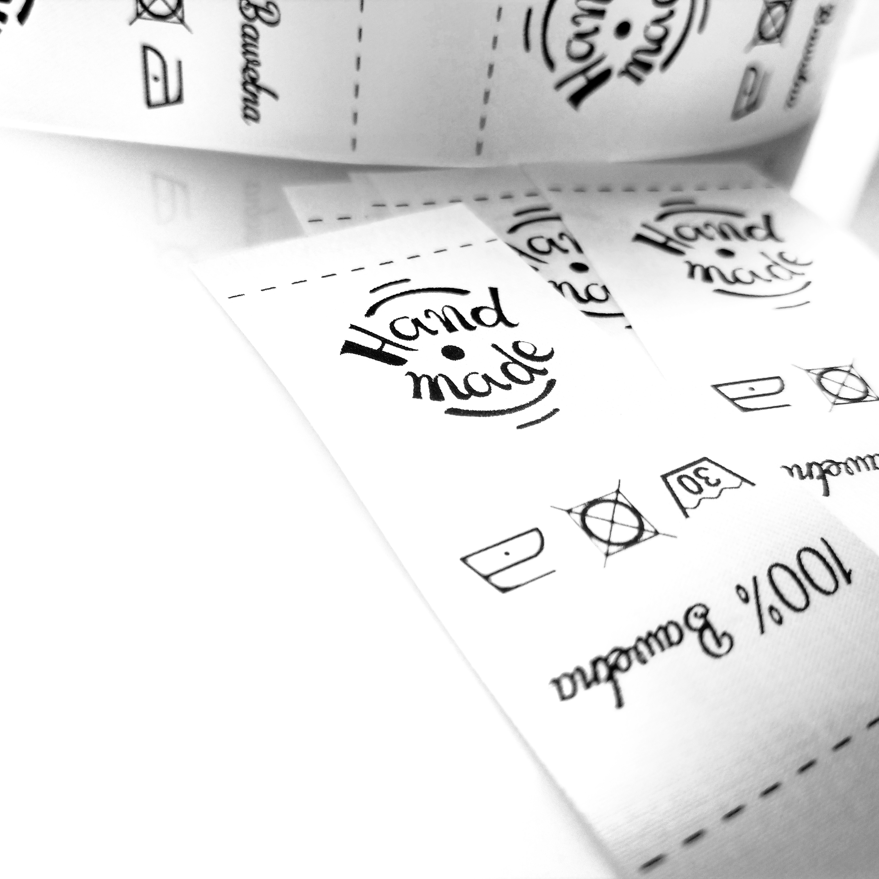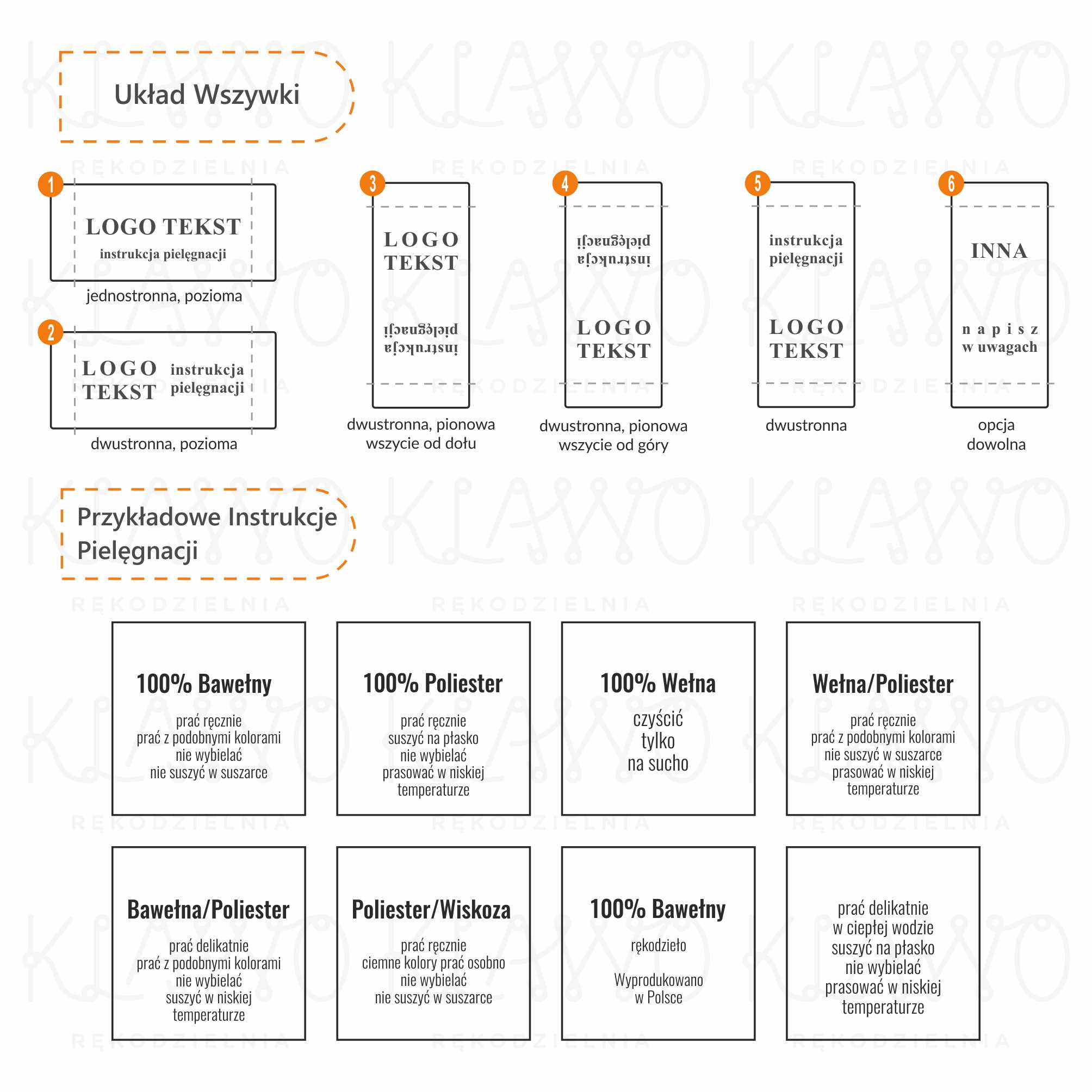 - Symbole konserwacji - symbole wskazują temperaturę, w której należy prać odzież, możliwość suszenia w suszarce bębnowej oraz inne istotne informacje. Wybierz opcje, a my w oparciu o Twoje wytyczne przygotujemy projekt